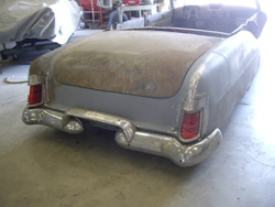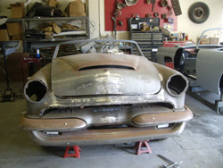 The Project has been taken to Alan Johnson of Johnson's Rod & Custom in Riverside Ca. He has inserted a 1956 Chevy which acquired from Rich Evans into the Merc body for an original smooth flow look of the heartbeat. Alan Johnson will be completing all the rest of the body modifications to the project. Also Brandon McGill of Spotlite Kustom Accessories has donated some much needed new Hood hinges.